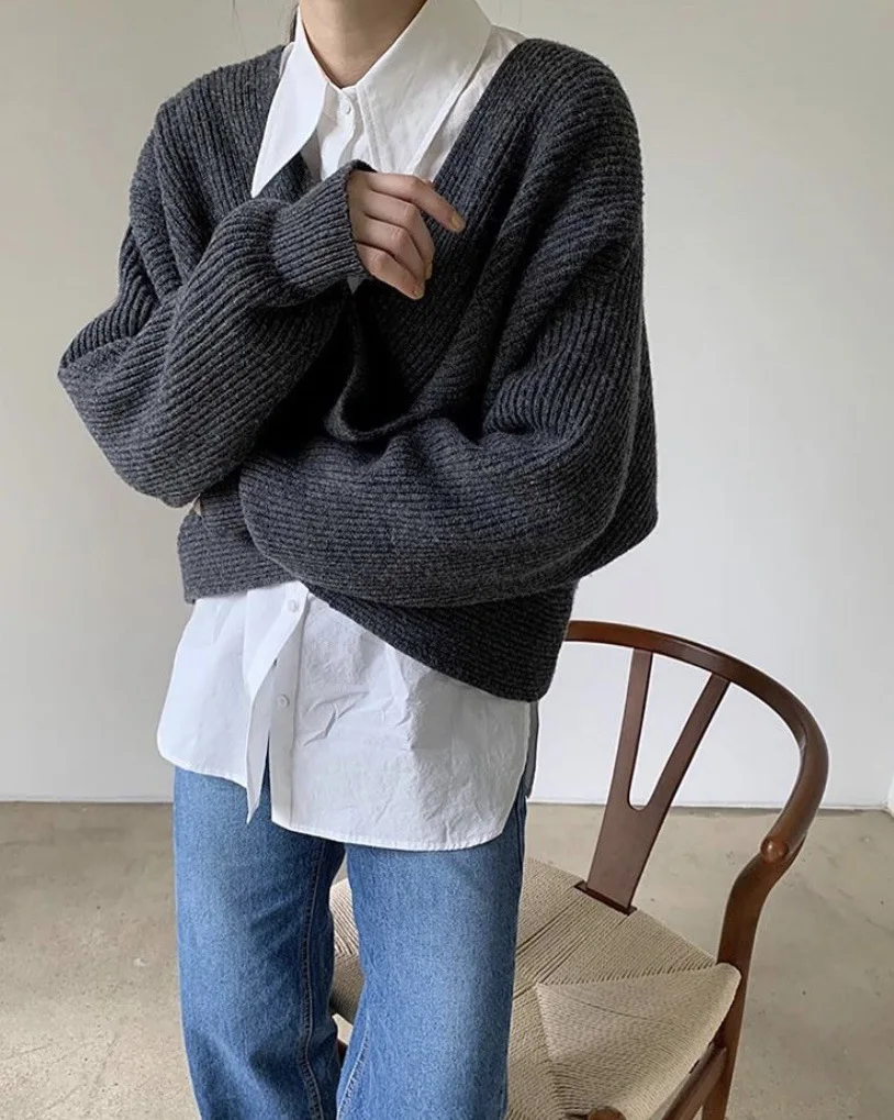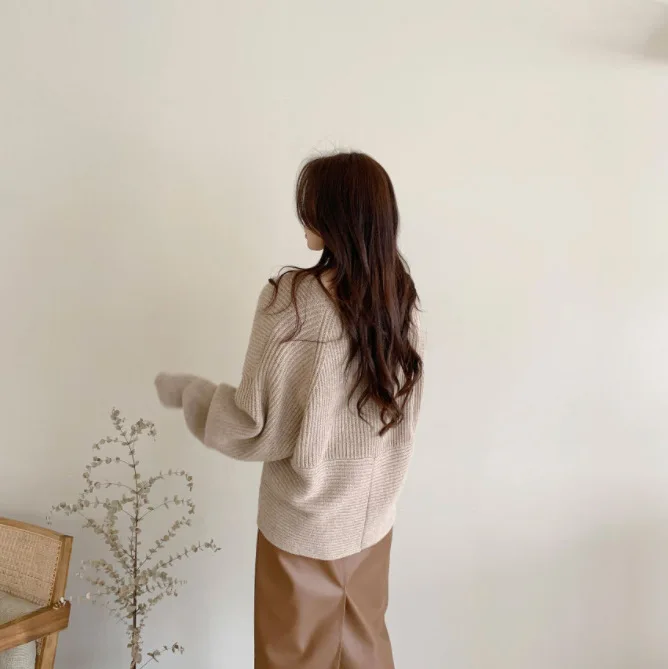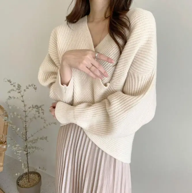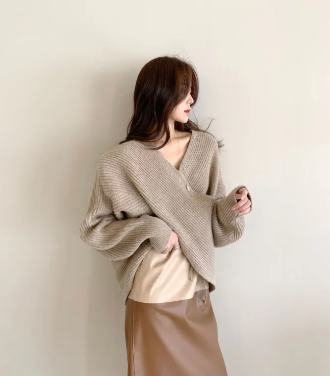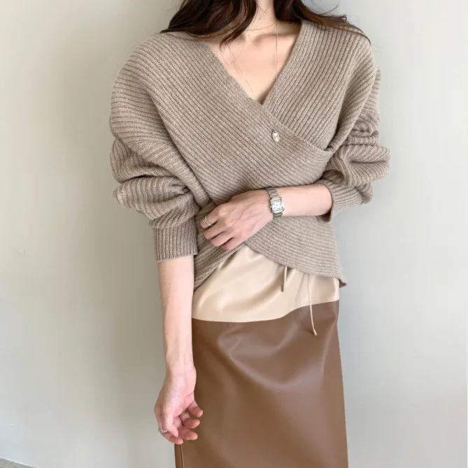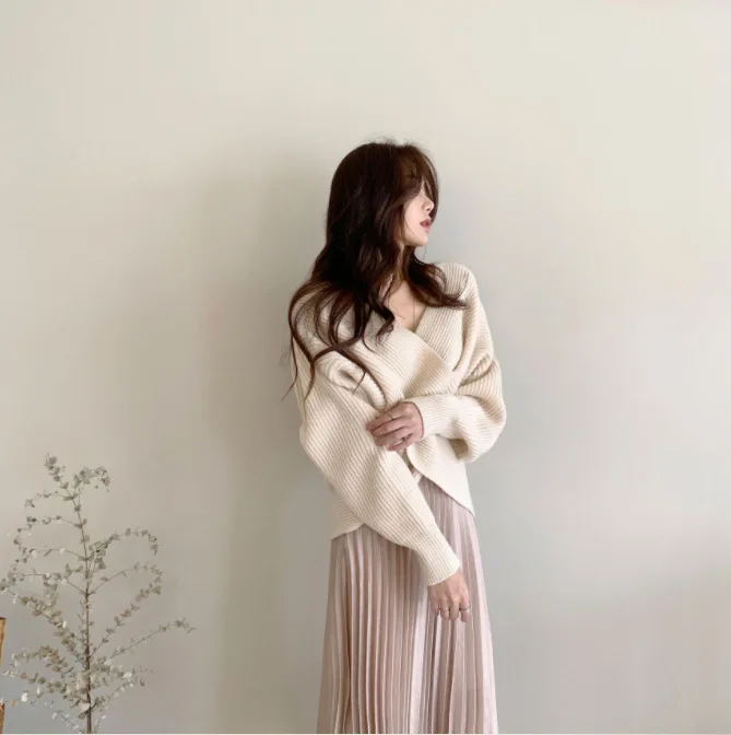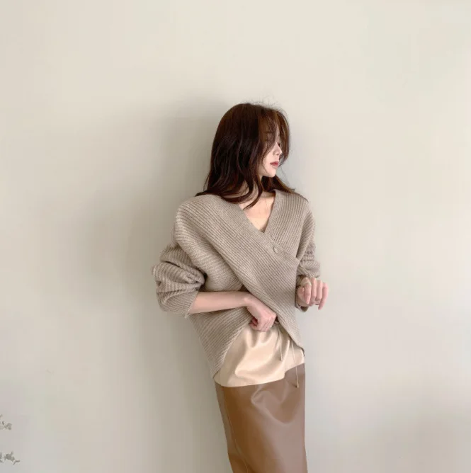 2021 autumn and winter Korean version of the new women's temperament simple cross V-neck loose knit sweater sweater top