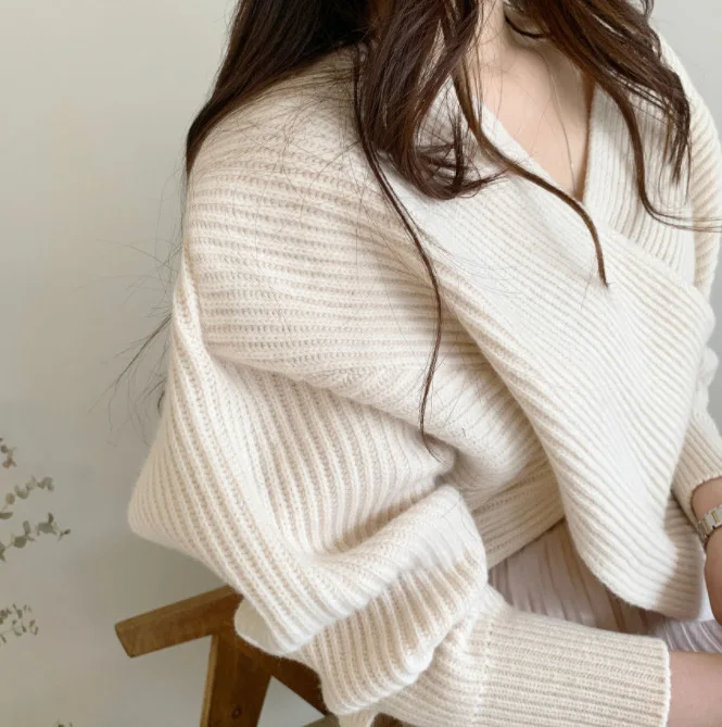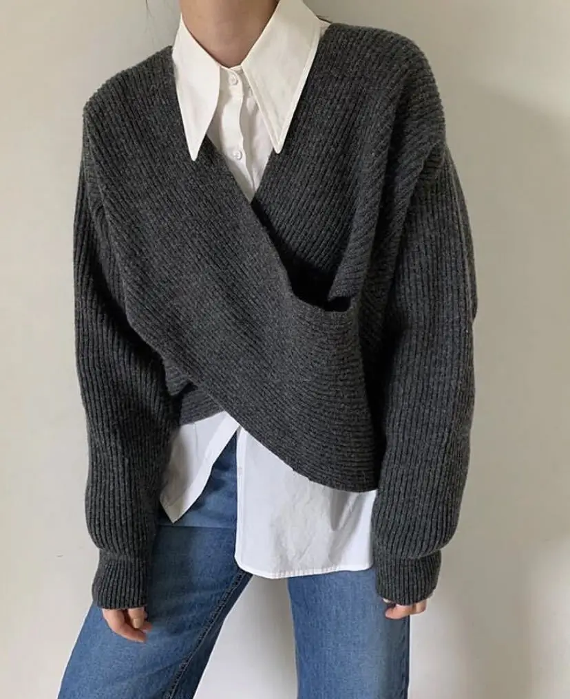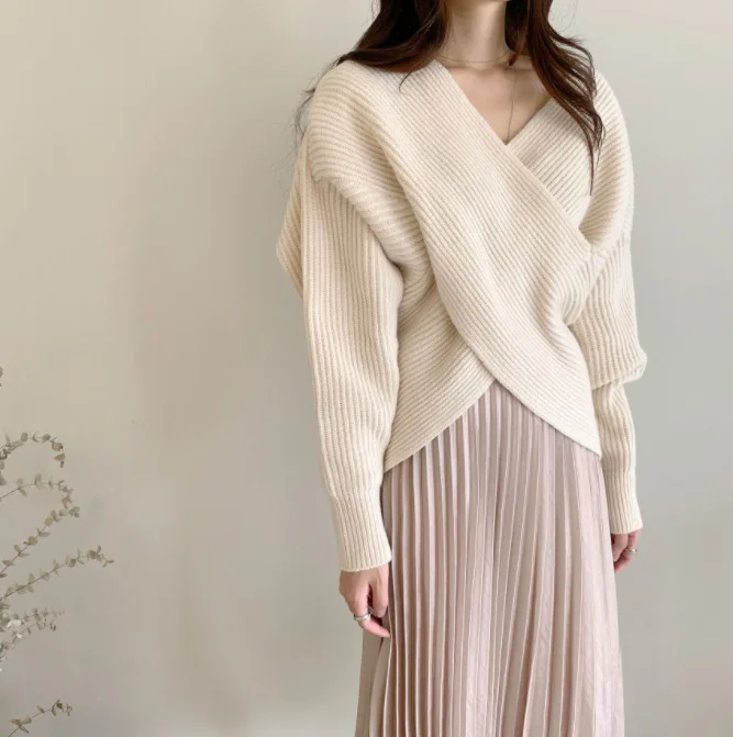 V Neck Long Sleeves Chic Criss-Cross Sweater Pullover Korean Style Knitted Fit Sweater Top Warm Elegant Outerwear Autumn Winter
